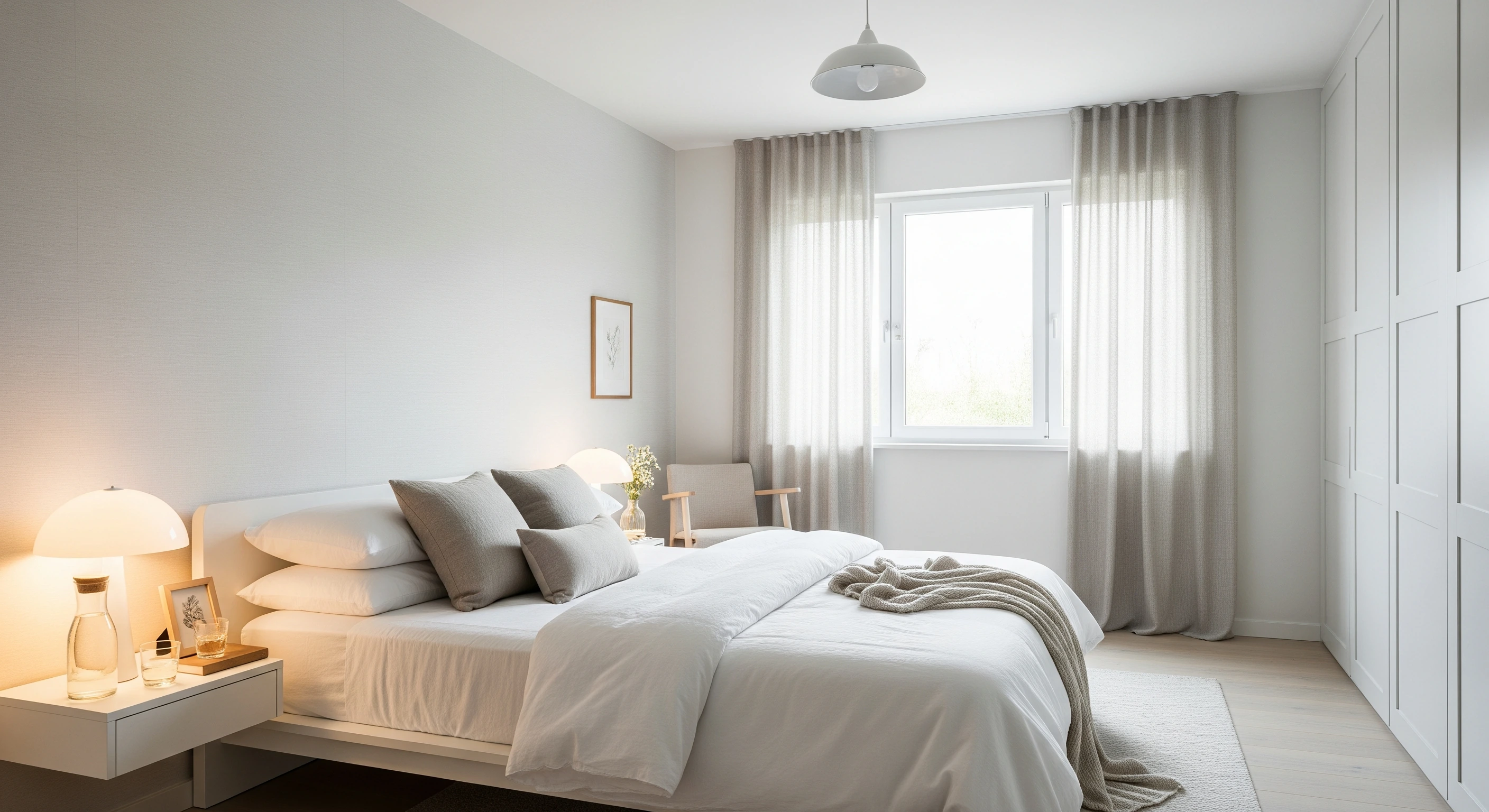 The focus shifts to quality textures, like soft linens and a single piece of art, ensuring guest comfort without overwhelming the senses.